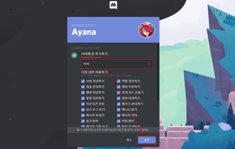 2. 새로 나오는 창에서 서버를 선택하신 뒤 승인버튼을 눌러주시면 로봇이 아님을 확인한 뒤 선택하신 서버에 봇이 들어오게 됩니다.
